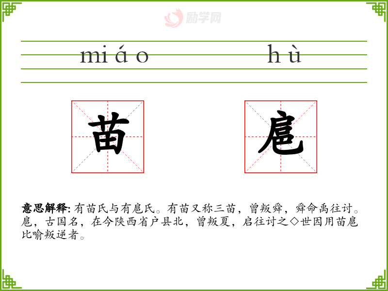 苗扈的意思是:有苗氏与有扈氏。有苗又称三苗,曾叛舜,舜命禹往讨。扈,古国名,在今陕西省户县北,曾叛夏,启往讨之◇世因用苗扈比喻叛逆者。