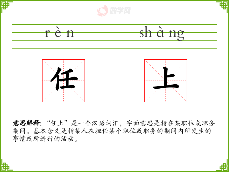 “任上”是一个汉语词汇,字面意思是指在某职位或职务期间。基本含义是指某人在担任某个职位或职务的期间内所发生的事情或所进行的活动。