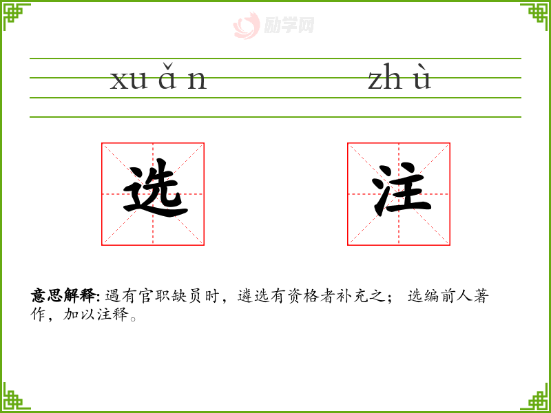 选注的意思是:遇有官职缺员时,遴选有资格者补充之; 选编前人著作,加以注释。