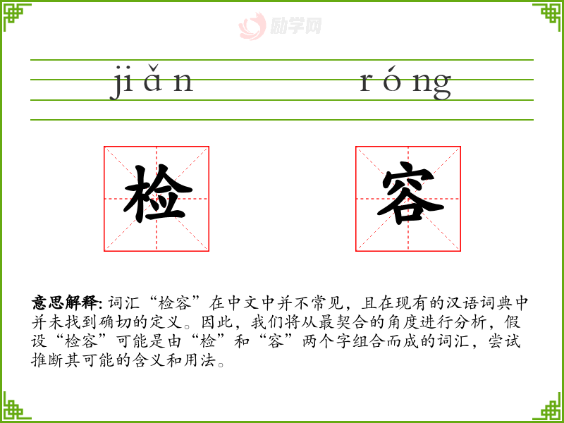 词汇“检容”在中文中并不常见,且在现有的汉语词典中并未找到确切的定义。因此,我们将从最契合的角度进行分析,假设“检容”可能是由“检”和“容”两个字组合而成的词汇,尝试推断其可能的含义和用法。