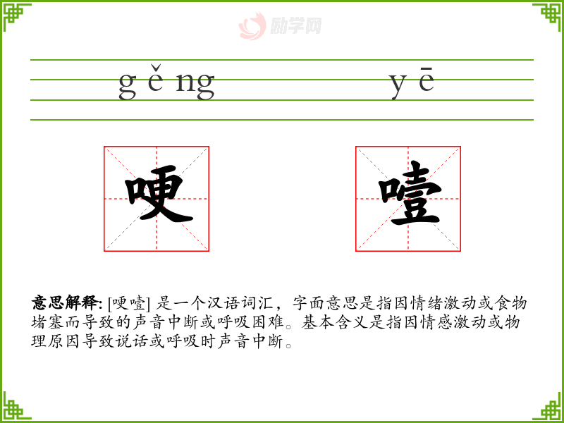 - 文学:在文学作品中,哽噎常用来描述人物因强烈的情感(如悲伤、愤怒、激动)而无法顺畅说话的情景,增强了情感的表达和氛围的营造。