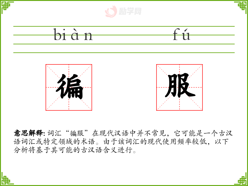 词汇“徧服”在现代汉语中并不常见,它可能是一个古汉语词汇或特定领域的术语。由于该词汇的现代使用频率较低,以下分析将基于其可能的古汉语含义进行。