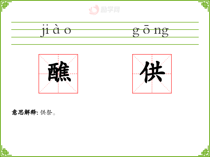 《说文》-供,设也。 《后汉书·班彪传》-供帐。 《明史·海瑞传》-曩胡公按部,令所过毋供张。 《明史·海瑞传》-士大夫出其境率不得供顿,由是怨颇兴。