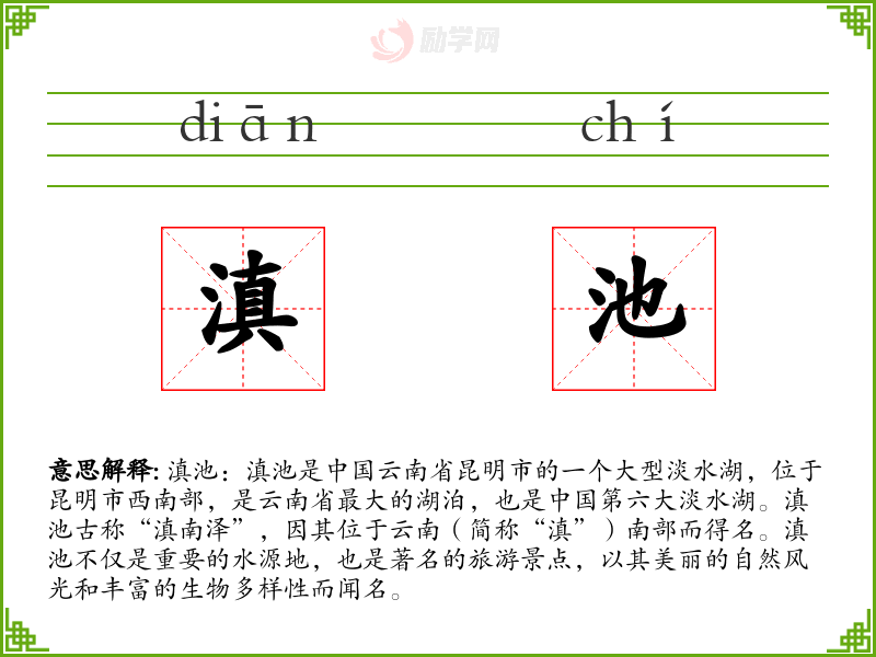 滇池作为一个地理名称,不仅代表了具体的自然景观,也承载了丰富的文化和生态意义。在语言学*和表达中,了解和使用这样的词汇有助于更深入地理解相关地区的文化和环境背景。