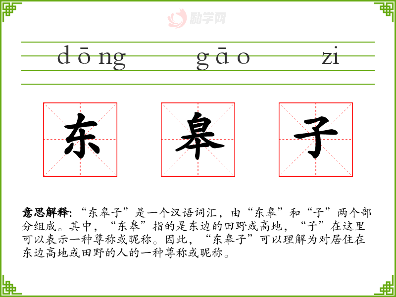 “东皋子”是一个汉语词汇,由“东皋”和“子”两个部分组成。其中,“东皋”指的是东边的田野或高地,“子”在这里可以表示一种尊称或昵称。因此,“东皋子”可以理解为对居住在东边高地或田野的人的一种尊称或昵称。