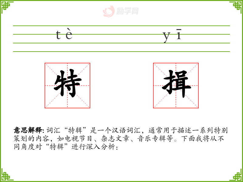 “特辑”作为一个词汇,在媒体和出版领域中扮演着重要角色,它不仅提供了深入探讨主题的机会,也增强了内容的吸引力和专业性。在我的语言学*和表达中,理解和运用“特辑”有助于我更好地理解和创作有深度的内容。