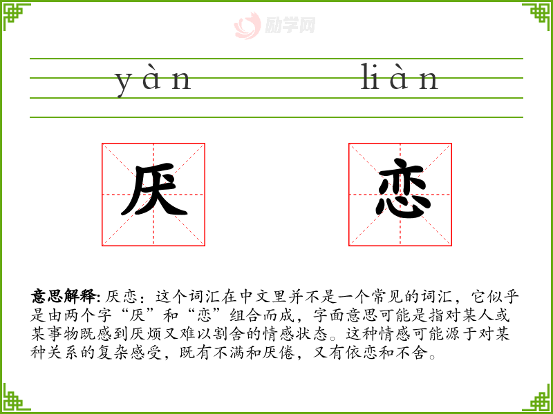 厌恋:这个词汇在中文里并不是一个常见的词汇,它似乎是由两个字“厌”和“恋”组合而成,字面意思可能是指对某人或某事物既感到厌烦又难以割舍的情感状态。这种情感可能源于对某种关系的复杂感受,既有不满和厌倦,又有依恋和不舍。