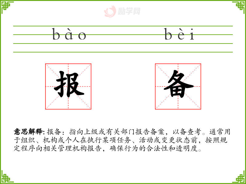 报备是一个在组织和管理中非常重要的词汇,它不仅体现了对规则的遵守,也反映了个人和组织对责任的承担。在学*语言和表达中,理解和正确使用“报备”有助于提高沟通的准确性和效率。