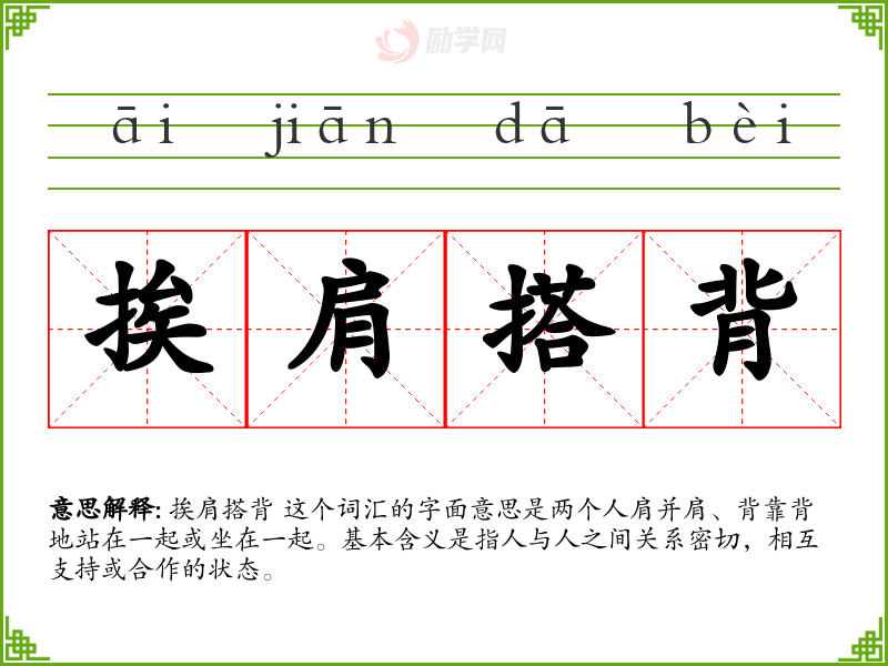 挨肩搭背 这个词汇的字面意思是两个人肩并肩、背靠背地站在一起或坐在一起。基本含义是指人与人之间关系密切,相互支持或合作的状态。