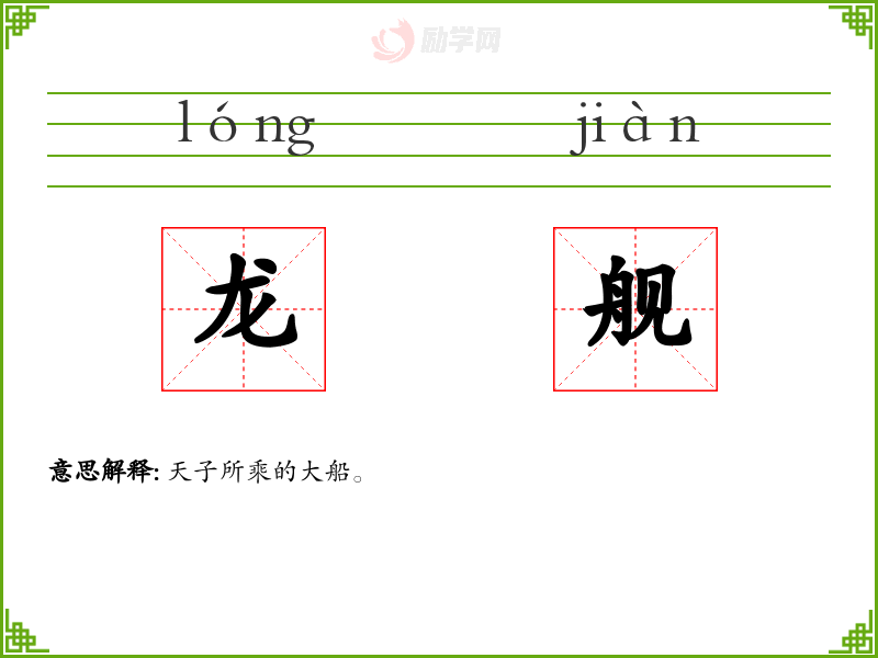 同本义。传说中的一种长形、有鳞、有角的神异动物,能走,能飞,能游泳,能兴云作雨。