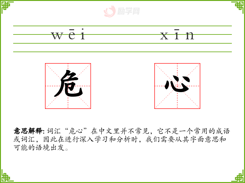 词汇“危心”在中文里并不常见,它不是一个常用的成语或词汇,因此在进行深入学习和分析时,我们需要从其字面意思和可能的语境出发。