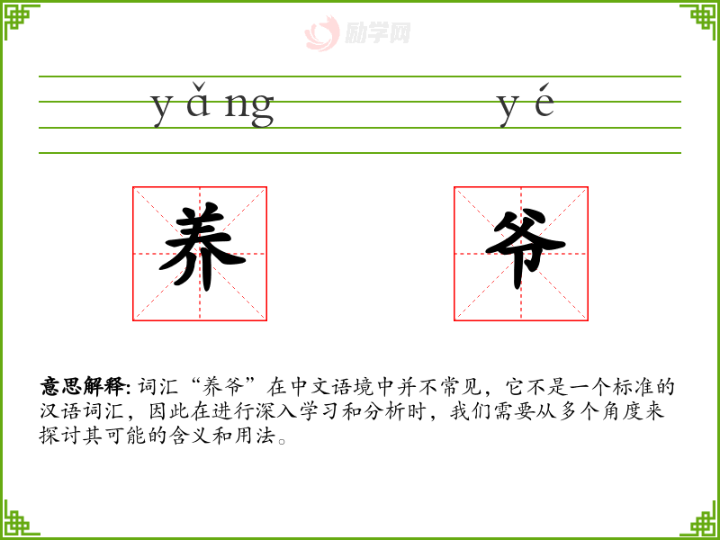 “养爷”字面意思可能是指“供养爷爷”或“照顾爷爷”。然而,由于这个词汇并不常见,它的确切含义可能需要根据具体的语境来确定。