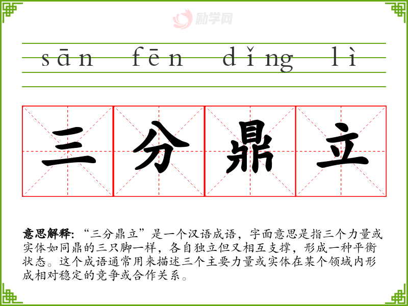 “三分鼎立”源自**古代的鼎,鼎有三只脚,象征着稳定和平衡。这个成语在历史上多用于描述三国时期的政治格局,后来逐渐泛指任何三个主要力量或实体的平衡状态。
