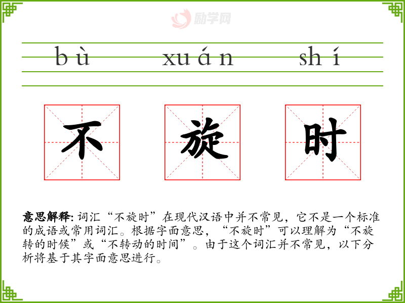 词汇“不旋时”在现代汉语中并不常见,它不是一个标准的成语或常用词汇。根据字面意思,“不旋时”可以理解为“不旋转的时候”或“不转动的时间”。由于这个词汇并不常见,以下分析将基于其字面意思进行。