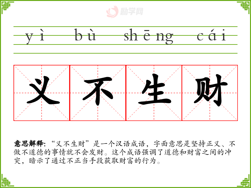 “义不生财”是一个汉语成语,字面意思是坚持正义、不做不道德的事情就不会发财。这个成语强调了道德和财富之间的冲突,暗示了通过不正当手段获取财富的行为。