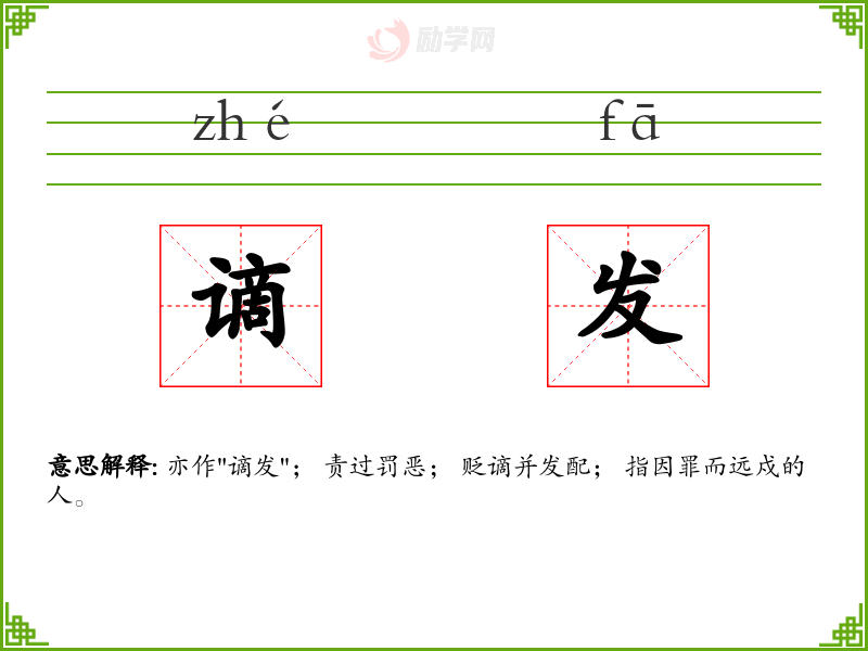 《说文》-谪,罚也。 《通俗文》-罚罪者曰谪。 《左传·成公十七年》-国子谪我。 《左传·昭公七年》-则自取谪于日月之灾。 《老子》-善言无瑕谪。 《列子·力命》-穷年不相谪发。 《左传·桓公十八年》-公会齐侯于泺,遂及文姜如齐。齐侯通焉。公谪之。 《诗·邶风·北门》-室人交遍谪我。