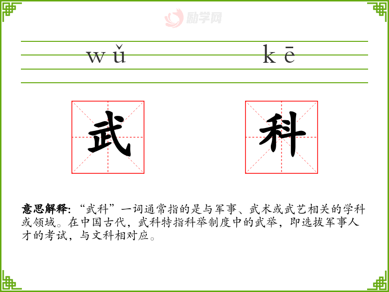 - 口语:在现代口语中,武科可能被用来泛指与军事或武术相关的技能和知识。