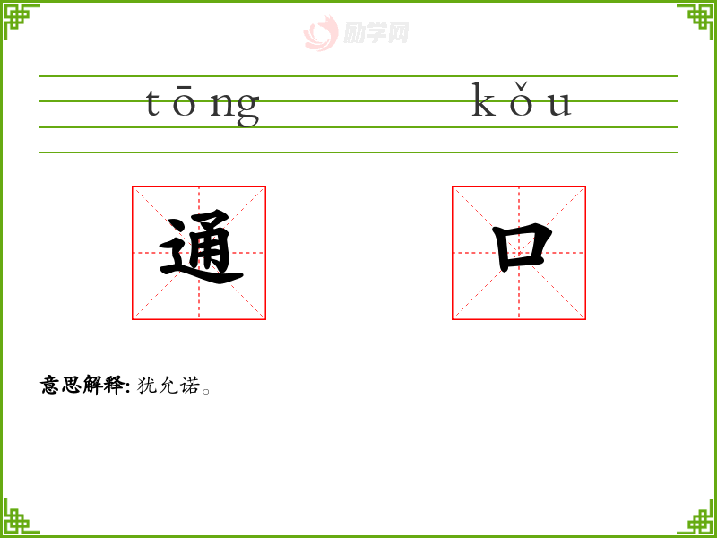 《说文》-口,人所以言食也。 《国语·晋语》-且夫口三五之门也。 《春秋·元命苞》-口之为言达也。 《鬼谷子·捭阖》-口者心之门户。 《左传·定公四年》-勺饮不入口七日。 《后汉书·张衡传》-下有蟾蜍,张口承之。 白居易《卖炭翁》-卖炭得钱何所营?身上衣裳口中食。
