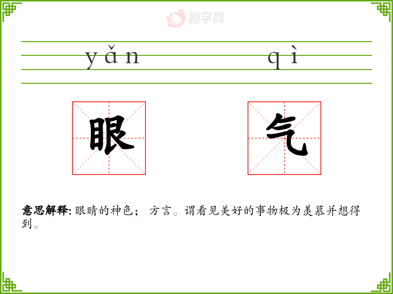 眼气的意思是:眼睛的神色; 方言。谓看见美好的事物极为羡慕并想得到。