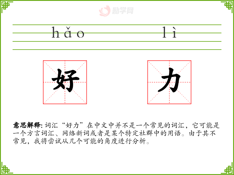 由于“好力”不是一个广泛认知的词汇,它在不同语境下的使用可能非常有限。如果是在某个特定的方言或社群中,它可能被用来形容某人的能力很强或者某件事做得很出色。