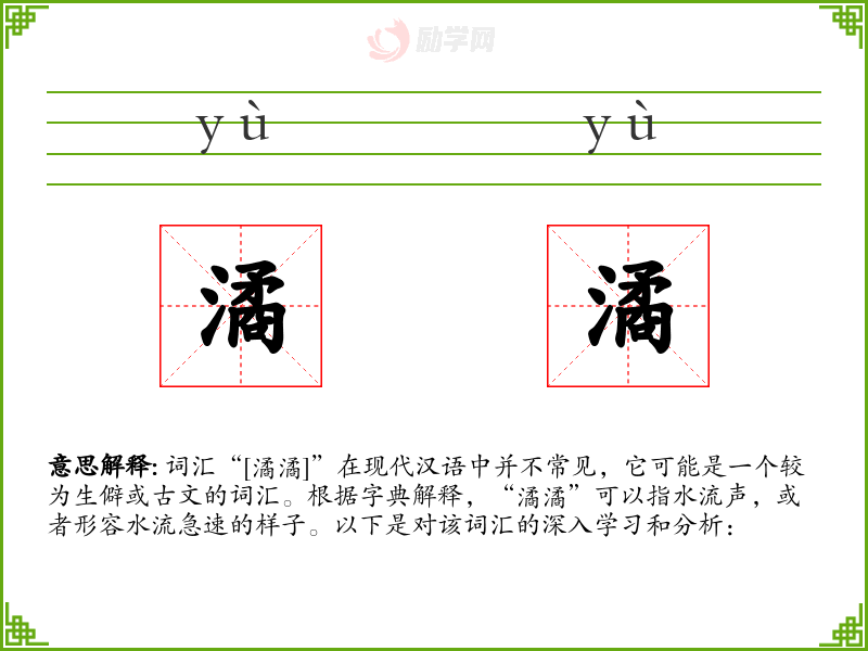 - 对应词汇:在其他语言中,可能没有直接对应的词汇,但可以用类似的形容词来描述水流的声音。