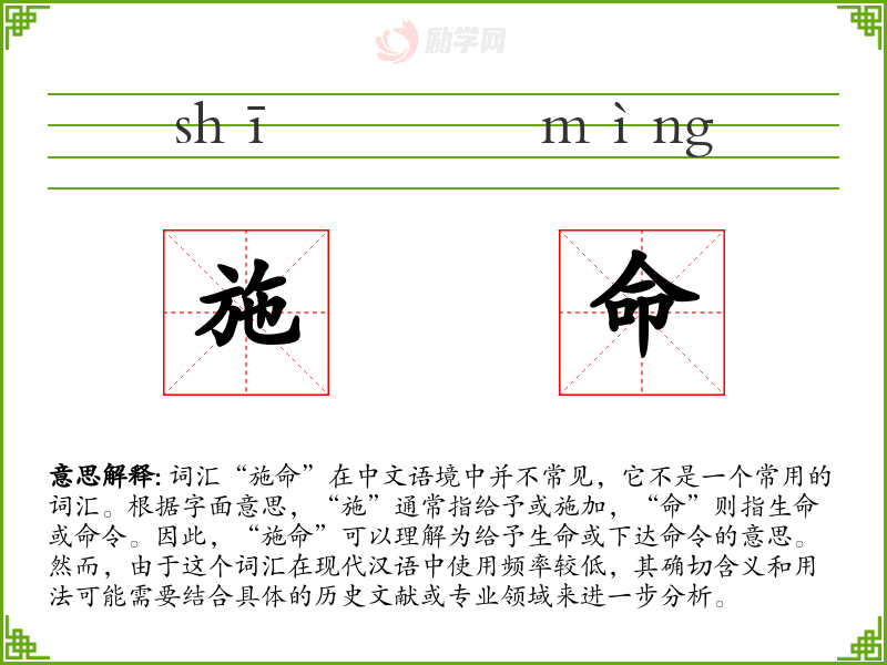 由于“施命”不是一个常用词汇,它在不同语境下的使用可能较为有限。在古代文学或历史文献中,可能用于描述赋予生命或下达重要命令的场景。