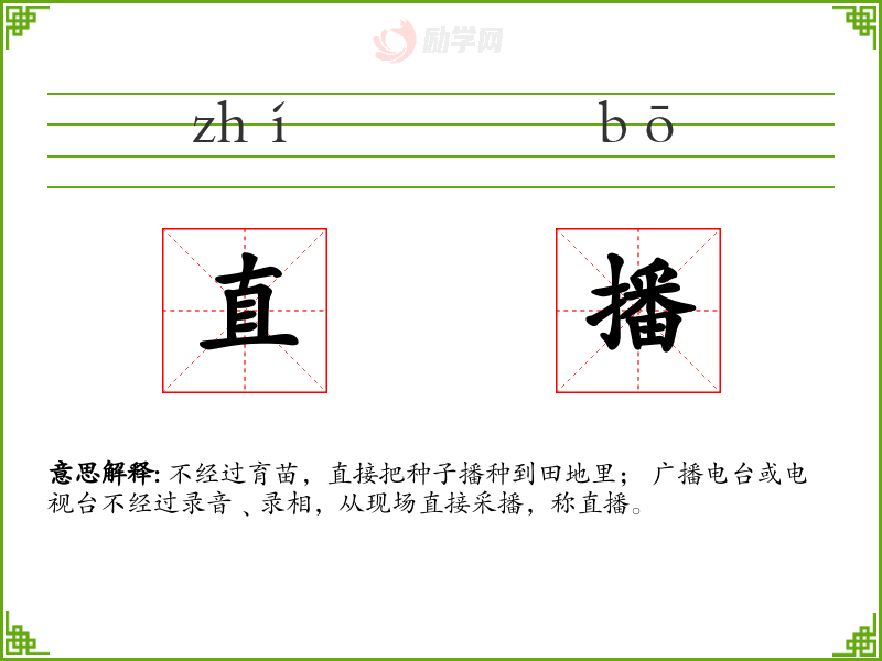 直播的意思是:不经过育苗,直接把种子播种到田地里; 广播电台或电视台不经过录音﹑录相,从现场直接采播,称直播。