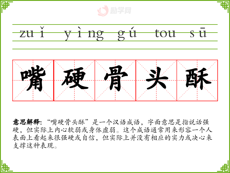 “嘴硬骨头酥”是一个汉语成语,字面意思是指说话强硬,但实际上内心软弱或身体虚弱。这个成语通常用来形容一个人表面上看起来很强硬或自信,但实际上并没有相应的实力或决心来支撑这种表现。