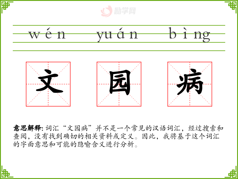 词汇“文园病”并不是一个常见的汉语词汇,经过搜索和查阅,没有找到确切的相关资料或定义。因此,我将基于这个词汇的字面意思和可能的隐喻含义进行分析。