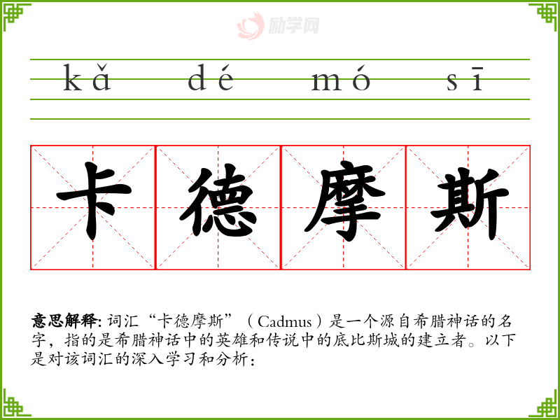 词汇“卡德摩斯”(Cadmus)是一个源自希腊神话的名字,指的是希腊神话中的英雄和传说中的底比斯城的建立者。以下是对该词汇的深入学习和分析:
