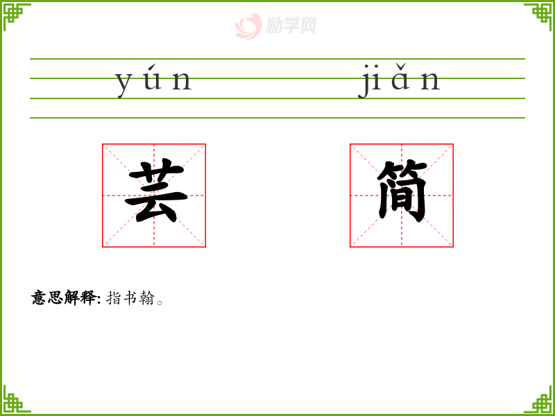 《诗·小雅·出车》-畏此简书。 《礼记·王制》。注:“策书也。”-执简记。 《考工记·弓人》-小简而长。 《韩非子·外储说左下》-昭王读法十余简而睡卧矣。 《左传·襄公二十五年》-南史氏闻太史尽死,执简以往。