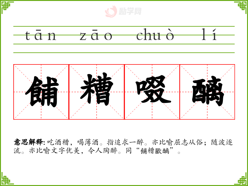 《说文》-糟,酒滓也。 《周礼·酒正》。注:“糟,醫酏之不醫者,醫者曰清。”-共后之致饮于宾客之礼醫酏糟。 《礼记·内则》。注:“糟,醇也。”-稻醴清糟。 《墨子·公输》-邻有糠糟。 《史记·屈原贾生列传》-何不餔其糟。