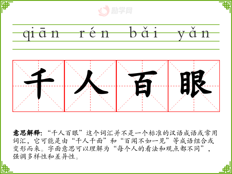 由于“千人百眼”不是一个常用词汇,它在不同语境下的使用可能较为有限。在文学作品中,可能会用来形容人们对同一事物的不同看法或评价;在口语中,可能用来表达对某件事情的多样性观点或个人感受的差异。