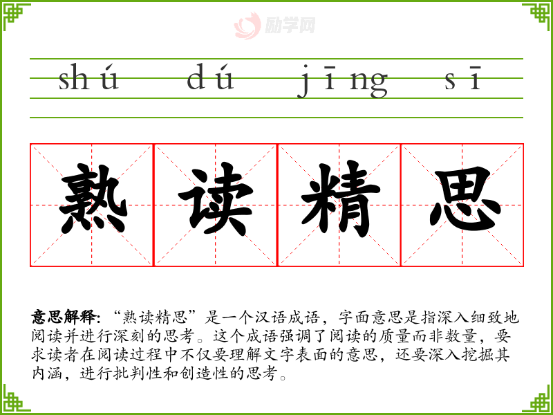 “熟读精思”是一个汉语成语,字面意思是指深入细致地阅读并进行深刻的思考。这个成语强调了阅读的质量而非数量,要求读者在阅读过程中不仅要理解文字表面的意思,还要深入挖掘其内涵,进行批判性和创造性的思考。