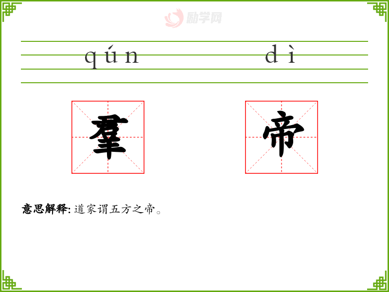 帝[ dì ] 1. (象形。甲骨文字形,象花蒂的全形。上面象花的子房,中间象花萼(花瓣外面的绿片)。下面下垂的象雌雄花蕊。本义:花蒂)。 2. 天帝,上帝。宗教或神话中称主宰万物的神。最高的天神。古人想像中宇宙万物的主宰。 【引证】 《字汇》-帝,上帝,天之神也。 《诗·大雅·文王》-帝命不时。 [更多解释]