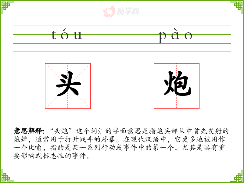 “头炮”这个词汇的字面意思是指炮兵部队中首先发射的炮弹,通常用于打开战斗的序幕。在现代汉语中,它更多地被用作一个比喻,指的是某一系列行动或中的第一个,尤其是具有重要影响或标志性的。