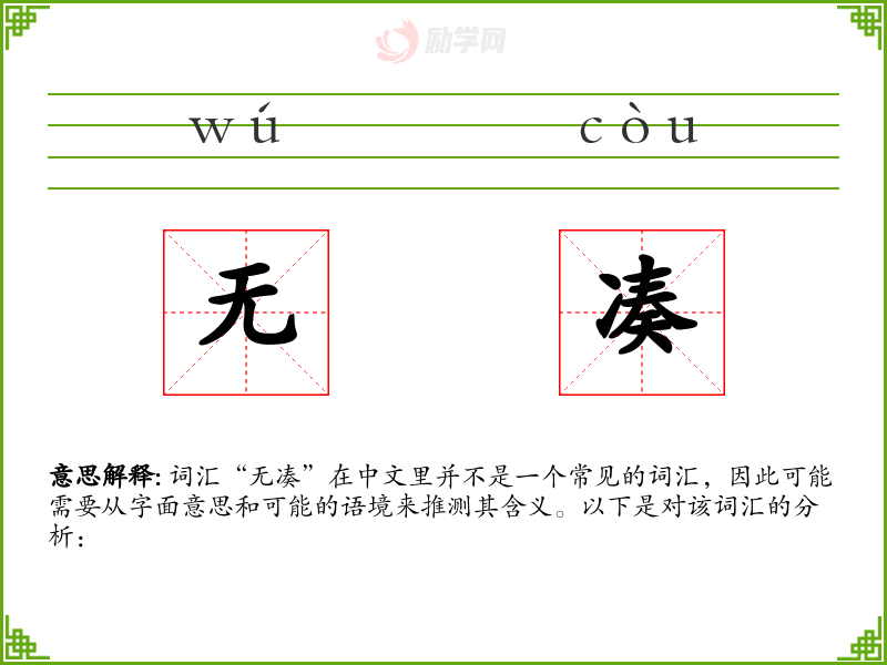 词汇“无凑”在中文里并不是一个常见的词汇,因此可能需要从字面意思和可能的语境来推测其含义。以下是对该词汇的分析: