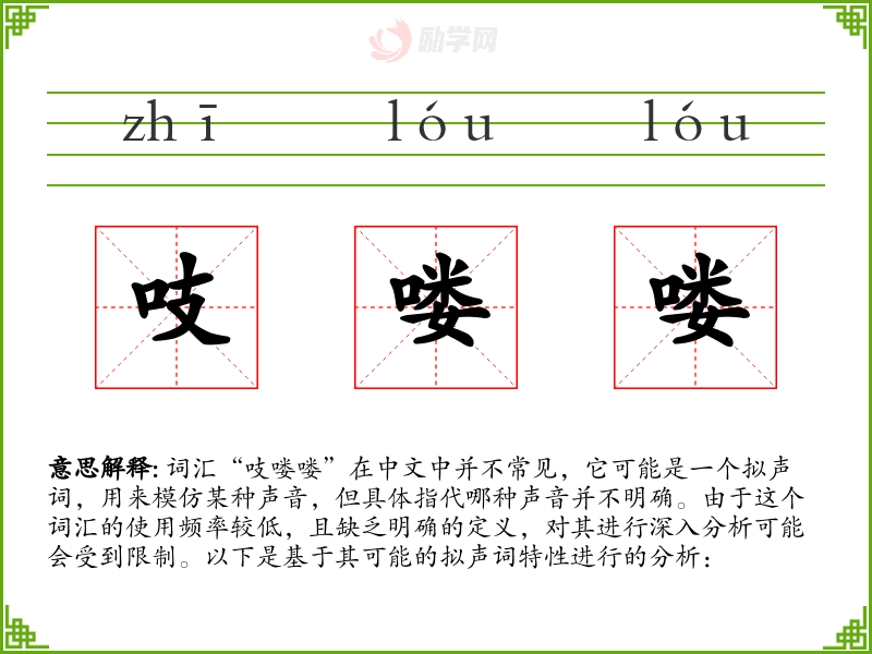 词汇“吱喽喽”在中文中并不常见,它可能是一个拟声词,用来模仿某种声音,但具体指代哪种声音并不明确。由于这个词汇的使用频率较低,且缺乏明确的定义,对其进行深入分析可能会受到限制。以下是基于其可能的拟声词特性进行的分析: