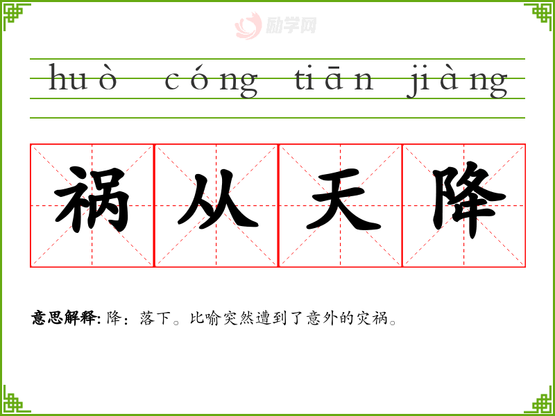 《说文》-禍,害也。神不福也。 《周礼·掌客》-禍灾杀礼。 《史记·屈原贾生列传》-禍兮福所倚。 《荀子·天论》-逆其类者谓之禍。 《论衡·累害》-来不由我,古谓之祸。 《韩非子·大体》-鱼无失水之祸。 《韩非子·十过》-不顾国政,则亡国之祸也。 《战国策·赵策》-近者祸及身。 《淮南子·人间训》-不能为祸。 明·魏禧《大铁椎传》-祸且及汝。 《资治通鉴》-祸至无日。 清·龚自珍《病梅馆记》-文人画士之祸。 《广东军务记》-祸及枯骨。