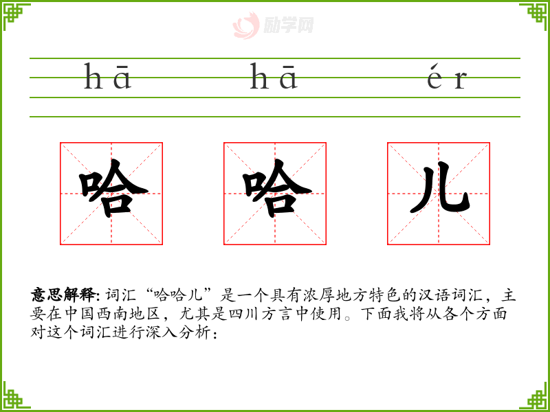 词汇“哈哈儿”是一个具有浓厚地方特色的汉语词汇,主要在**西南地区,尤其是四川方言中使用。下面我将从各个方面对这个词汇进行深入分析: