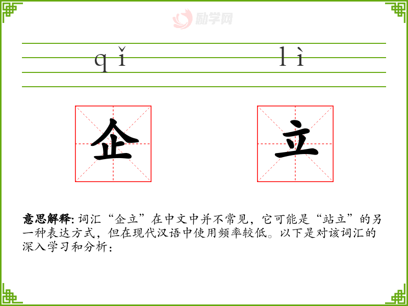 “企立”字面意思是指站立或直立的状态。其中,“企”字有站立的含义,而“立”字也是站立的意思,两者结合,强调了直立的姿势。
