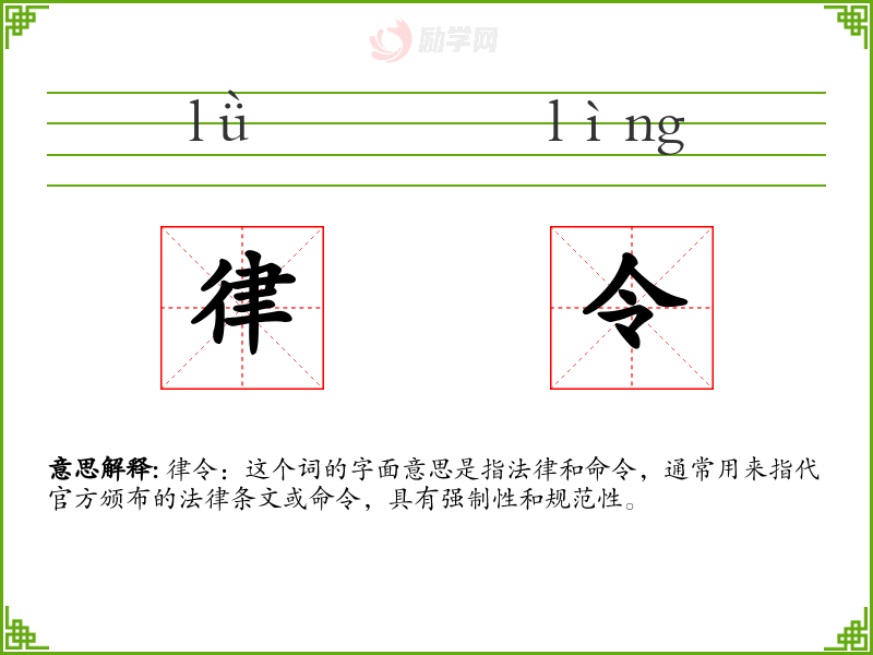 在视觉上,“律令”可能让人联想到古代的法律文书或现代的法律文件,具有正式和权威的外观。在听觉上,这个词可能与法庭的庄严氛围或法律讲座的严肃语气相关联。