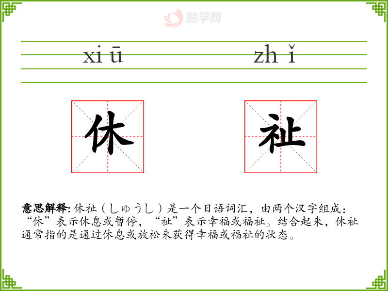 休祉(しゅうし)是一个日语词汇,由两个汉字组成:“休”表示休息或暂停,“祉”表示幸福或福祉。结合起来,休祉通常指的是通过休息或放松来获得幸福或福祉的状态。