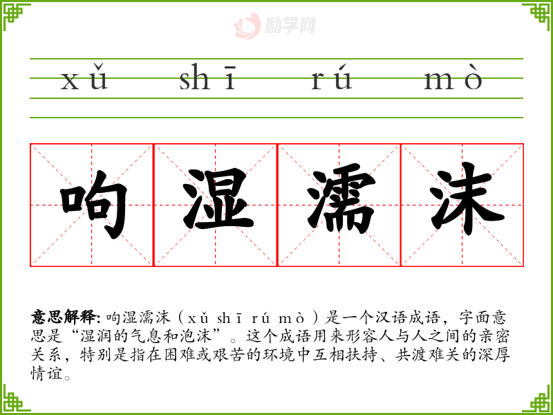 呴湿濡沫(xǔ shī rú mò)是一个汉语成语,字面意思是“湿润的气息和泡沫”。这个成语用来形容人与人之间的亲密关系,特别是指在困难或艰苦的环境中互相扶持、共渡难关的深厚情谊。