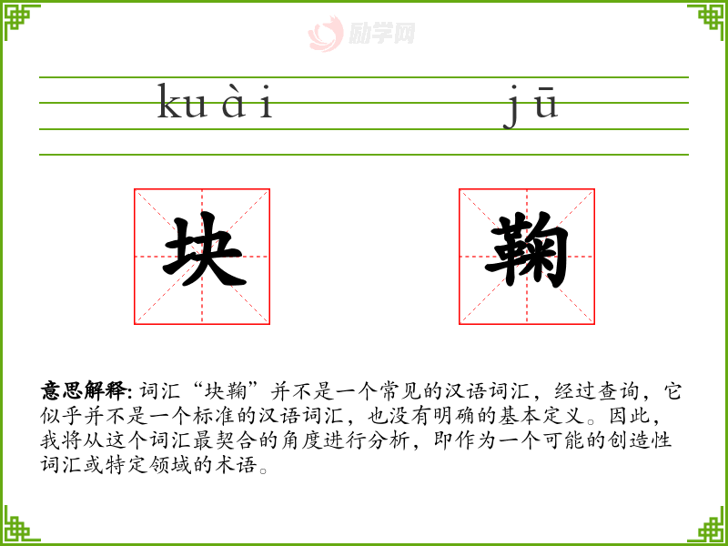 由于“块鞠”不是一个标准的汉语词汇,我们无法给出其字面意思和基本含义。它可能是由“块”和“鞠”两个字组合而成的,但这种组合在现有汉语词汇中并不常见。