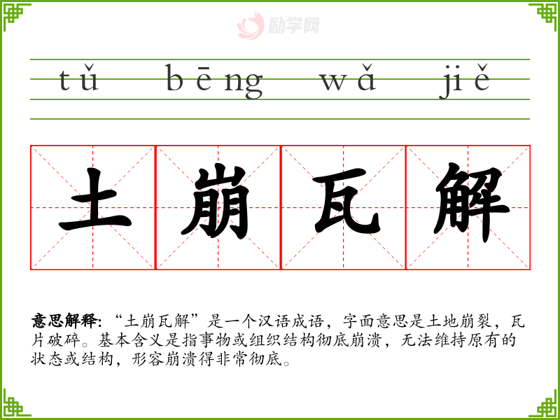 - 文学:在文学作品中,这个成语常用来形容一个王朝、国家或组织的崩溃,如“随着内战的爆发,这个古老的帝国开始土崩瓦解。”