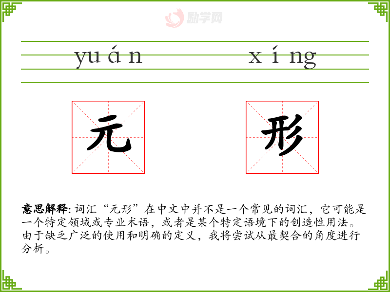 由于“元形”不是一个标准词汇,我无法对其进行深入的理解和反思。在语言学习和表达中,了解和使用标准词汇是非常重要的,而“元形”作为一个不常见的词汇,其使用和理解可能需要特定的语境和知识背景。