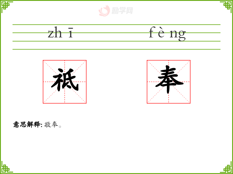 《说文》-祗,敬也。 《书·皋陶谟》-日尹祗敬六德。 《诗·商颂·长发》-上帝是祗。 《周礼·大司乐》-中和祗庸孝友。 《广雅》-祗,祗敬也。 《左传》-父不慈,子不祗,兄不友,弟不共,不相及也。