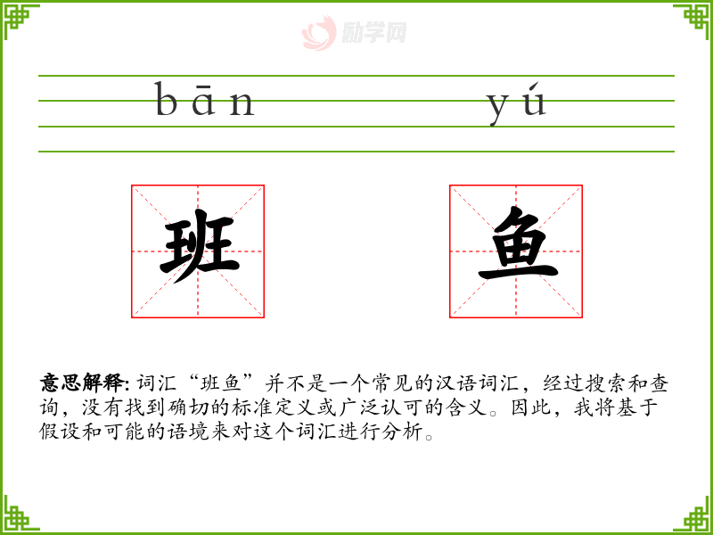 词汇“班鱼”并不是一个常见的汉语词汇,经过搜索和查询,没有找到确切的标准定义或广泛认可的含义。因此,我将基于假设和可能的语境来对这个词汇进行分析。