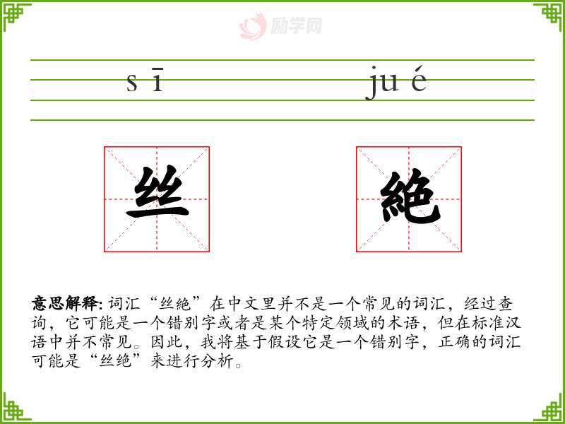 “丝绝”字面意思可能是指“丝绸的尽头”或“极其细腻的丝绸”。在现代汉语中,这个词汇并不常用,可能需要在特定的语境下才有意义。
